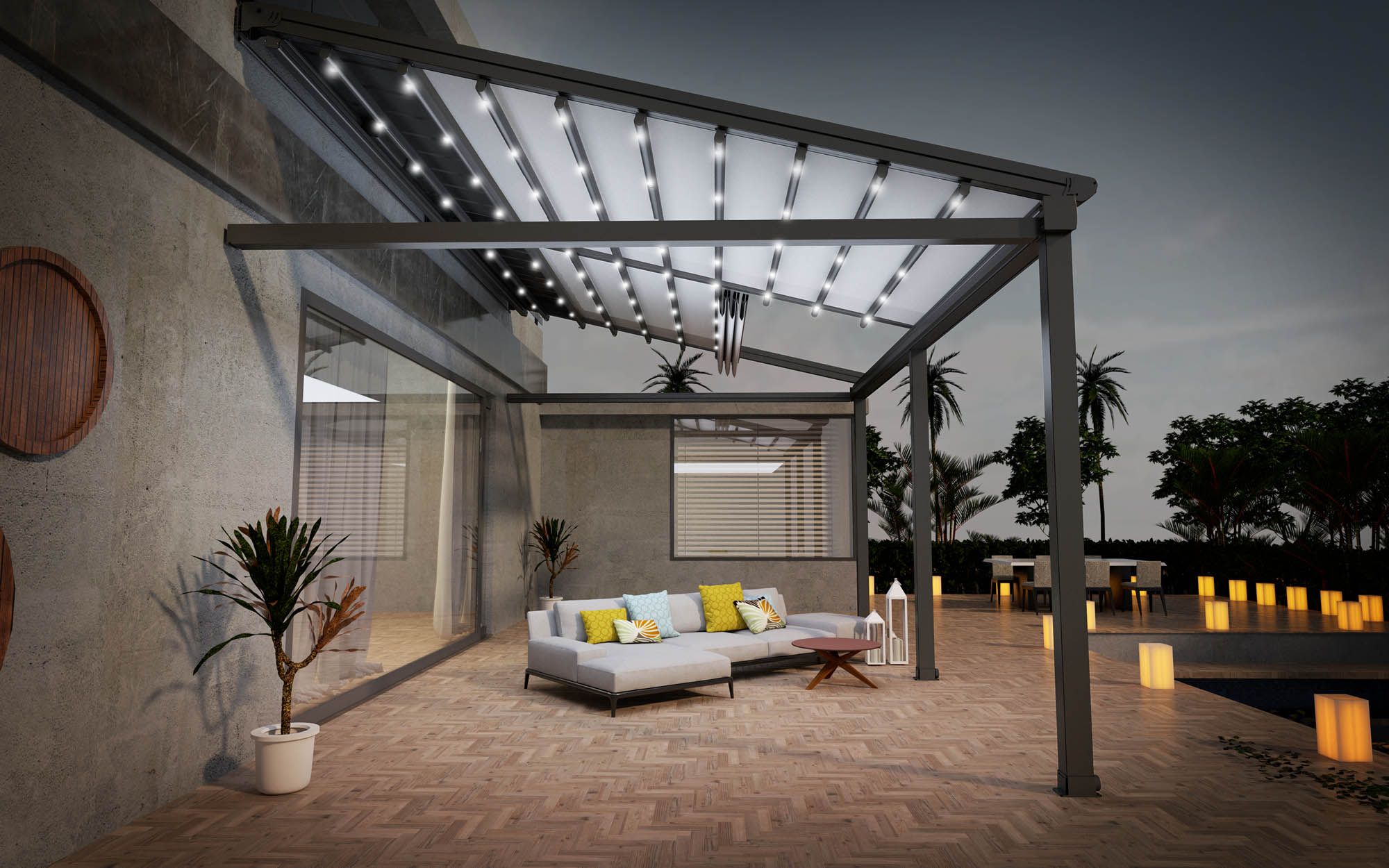Çok yönlü açılır kapanır tente genellikle havuz başı, villa, bahçe, teras, işyeri, restoran ve lokanta gibi bölümlerde tercih edilmektedir.